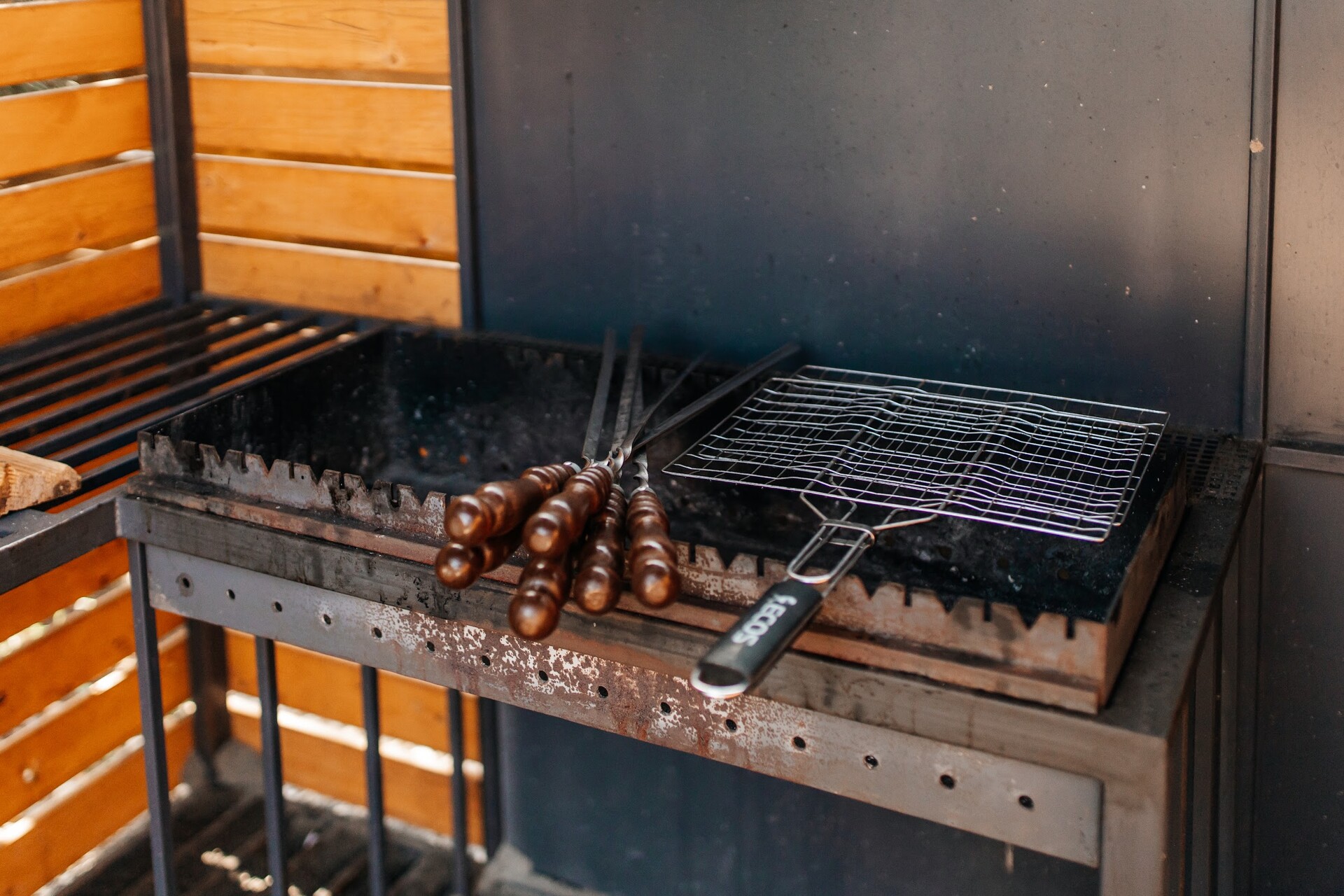Мангальная зона: сетка, шампура, уголь, розжиг